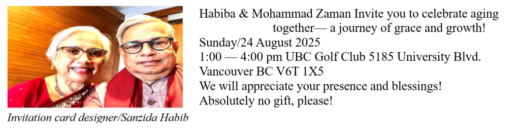 Reaching the age of 75 is a remarkable milestone. Both Habiba and I see it as a profound blessing, and we are sincerely grateful to the Almighty for allowing us to share this moment together. With hearts brimming with joy and appreciation, we welcomed our guests—mainly friends, fellow seniors from our Bengali community, along with several family members—to the University of British Columbia (UBC) Golf Club on 24 August 2025 to commemorate this special occasion.